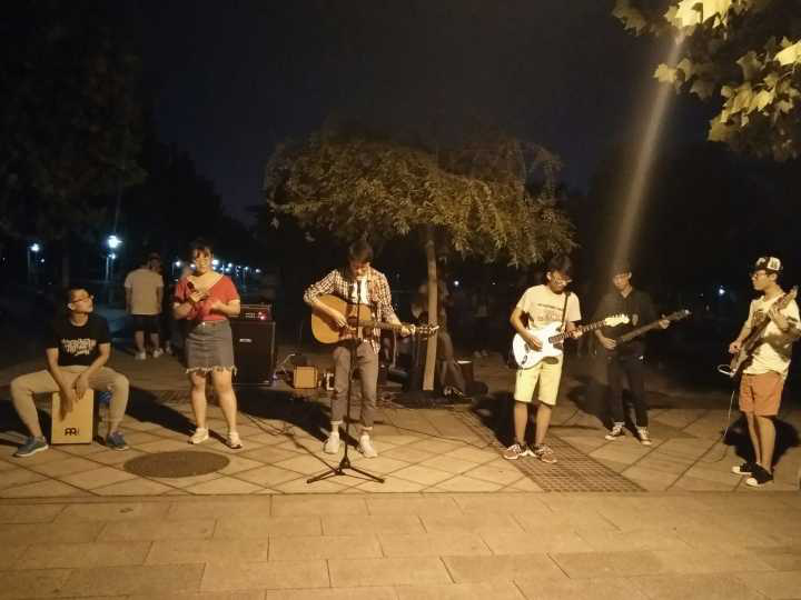 就在此刻,2017级的新生刚刚结束了一天的军训,在经过路演现场时,被歌声所吸引停留,与我们一同享受着这晚间惬意的时光,如此一来我们也完成了我们的使命——用音乐为每一个人带来快乐。