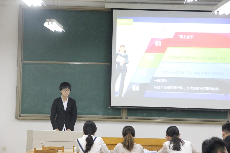 本次竞选本着“公平、公正、公开”的原则,共要选出综合事务部、宣传信息部、学习发展部、创新创业部、素质拓展部、社区服务部、权益保障部、文体活动部各部门部长一名、副部长两名。在竞选的过程中,每个竞选者都神态自然,语言流利,姿态端庄大方,他们都通过上台演讲向大家展示他们的工作经验,工作能力及对未来的工作做出规划,并充分表现出他们的自信心,责任心与上进心。竞选流程有条不紊的进行着,每位竞选者精彩的演讲都会博得台下师生的阵阵掌声。