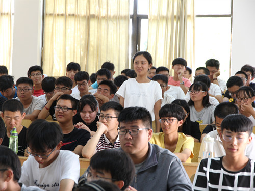 亓鹏首先为新生播放《吕传毅·大学之道》专题片,让学生了解吕传毅关于五有人才的理解和阐释,随后,亓鹏讲授“设定初心,争做五有人才”为主题的团课,希望新生早日设定大学目标,并通过自己坚持不懈的努力来实现自己的目标。并用“烈士”冯思广、“全国见义勇为英雄模范”宋彦峤、优秀校友孔凡厚、孙中伟等优秀校友的事迹,希望以他们作为榜样,让学生进一步了解什么样的人是“五有”人才,怎样成为“五有”人才。亓鹏在讲授实践能力里强调吕传毅书记提出的“把学生扔到实践中去”,鼓励新生认真学习,勇于实践,知行合一。针对学习,亓鹏再一次强调,要积极、认真学习,减少挂科现象,只有掌握好专业知识,才能有机会向更高更广的方面发展,才有能力向更高一个层次的目标追求。大学的学习要从各个方面武装自己,努力把个人强大起来,反馈母校,报答社会。
