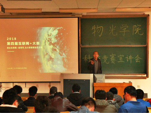 会议伊始,崔鹏老师首先对2018年度第四届全国“互联网+”创业大赛进行宣讲和动员,分别从“互联网+”比赛的背景,意义以及项目的选择等方面进行了讲述;其次,崔鹏老师根据学院专业特色,梳理了本学院学生历年来参加的比赛,将比赛分为三大类:创新创业类、专业相关类和其他类,同时将每一类包括的比赛从比赛简介、参赛要求、参赛时间以及赛事的重要性分别进行了详细介绍。最后,他讲到科技竞赛是知识和创新的结合,参赛经历对个人发展具有重要意义,希望同学们积极关注比赛,参加比赛,锻炼自己,即是自身成长成才的必要,也是时代发展的需要。同时,为让同学们更好的了解竞赛有关事宜,我院微信公众号也将会推出与竞赛相关的文章,供同学们参考。