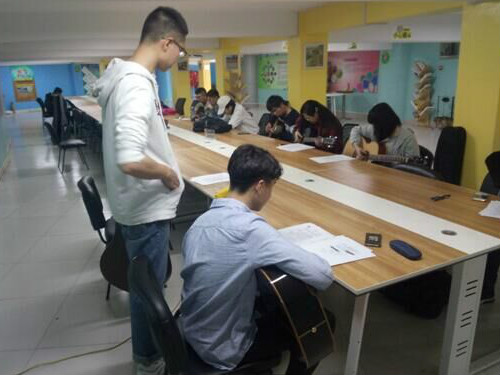 此次活动一改之前的会员教学风格,在教学之外增加干事之间琴技交流和技术部歌曲排练两项内容,并取得前所未有的良好效果。因为此次教学较为特殊,由韩光普对三位零基础的学员进行一对一的教学活动,故没有继续之前的教学进度(继续讲解赵磊的《鼓楼》),而是针对零基础的学员,从C调第一把位的音阶开始讲起,并介绍左右手的练习方法,对学员的一些错误指法进行纠正,最后通过音阶的歌曲实战进行巩固。成员还在教学之余进行和谐融洽的技术交流,从古典与民谣持琴方法的对比、和弦转换,到弗拉门戈扫弦技法、民谣P.M.指法均有涉及,这对于民谣、古典两种音乐风格的融合、弹琴音色的处理及技术上的融汇贯通大有脾益。