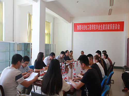 614日下午,我院在学院会议室举行毕业生建言献策座谈会,党总支书记常允起、院长董云会、党总支副书记戴洁、副院长刘瑞金、付圣贵,物理系主任王操、光电系党支部书记修俊山、实验中心主任孙艳、辅导员崔鹏以及2014级毕业生代表参加此次会议,会议由戴洁主持。