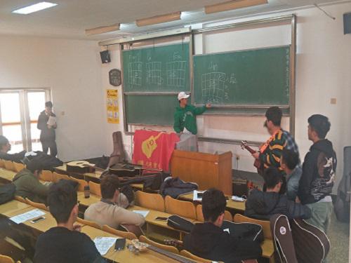 活动开始之前,干事们在黑板上写下培训教学内容,为活动的进行做好准备。培训伊始,干事们对会员的吉他进行调制。李伟嘉就此次活动注意事项进行讲话,他认为,此次活动旨在帮助会员掌握弹奏技巧,提高会员弹唱能力,会员们应遵守会场纪律,认真学习吉他弹奏方法。随后,为加强会员们对于指法的印像,同时便于日后会员们单独练习,李伟嘉为会员们讲解指间弹奏技巧,并亲自进行弹奏演示。之后活动进入自由练习时间,李伟嘉安排干事们对会员进行单独指导,会员们积极提问,干事一一为其解答,对于一些疑问较大的会员,干事们亲身示范,耐心讲解,会员们也表示对此次教学内容有了一定了解。