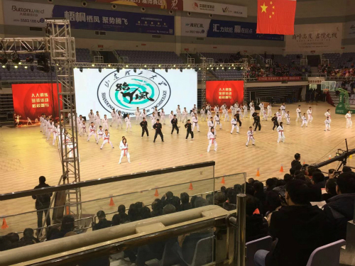 为参加本次体育文化展演活动,参加活动的同学们经历了近一个月的训练和彩排。比赛当天,为顺利完成本次表演,同学们早上六点半就已准备完毕,整装待发,共同赶往淄博市体育中心,充分做好相关准备工作。随着荧屏上同学们日常训练照片及相关视频的播出,比赛正式开始。表演中,队员们一丝不苟的出拳、出腿、上挡、下隔、腾空踢木板、跨多人后翻……迎来观众阵阵掌声。表演接近尾声时,更是有三名教练腾空跳起了高于他们身体的高度,踢裂木板,令人赞叹。表演结束,教练们跑步离场,整个展演厅里再次响起观众雷鸣般的掌声。