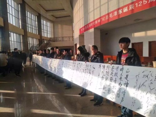 1226日是毛主席诞辰125周年,在这个伟大的日子里,全校师生书法爱好者代表在长12.26米的长卷上共同书写毛主席诗词,共同学习传承革命伟人的坚定信念和革命精神,培养青年学生的民族精神和爱国主义情怀。