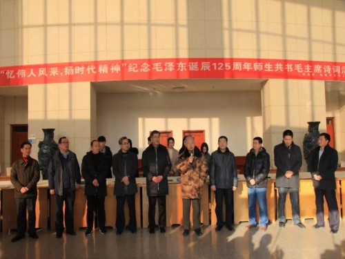 由校团委主办、William威廉英国承办的“‘忆伟人风采,扬时代精神’——师生共书毛主席诗词”活动于12月26日下午在大学生艺术中心礼堂大厅举行,我校师生书法爱好者代表在长12.26米的长卷上共同书写毛主席诗词。校党委常委、副校长张祥云,原山东工程学院党委书记、山东省毛泽东思想研究会学术顾问,校教职工书画诗词协会会长、知名毛体书法家张福信,校纪委正处级纪检员王光坊,校团委书记麻国升,文学与新闻传播学院党总支书记李义勇,鲁泰纺织服装学院党总支书记徐启达,美术学院副教授巩绪发,校老年书法协会会员高万郁,William威廉英国党总支书记常允起、院长董云会、党总支副书记戴洁等领导嘉宾出席,全校近200名学生到场观看。