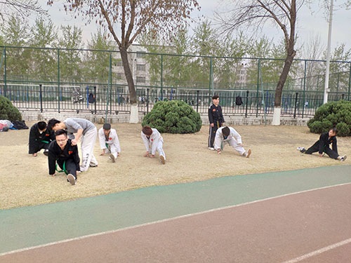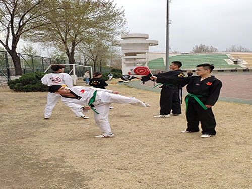 为训练舒展身体,更快适应训练需要,董超行首先带领全体成员做一系列热身运动,围绕体育场跑道跑三圈。稍事休息后,训练正式开始。训练伊始,董超行首先带领全体成员复习前一天的训练内容,使成员们重新拾起了记忆迷糊的动作要领,同时令其掌握得更加娴熟。然后,董超行带领全员进行柔韧拉伸训练,他详细的指出各种动作要领,要伸直左腿回勾左脚尖,右大腿垂直地面,右脚尖点地,吸气,延展胸腔向前,呼气,屈肘前屈,一定要坚持。阐述动作要领的同时,他近身指导成员的不规范动作,并强调容易做错的地方。紧接着,董超行带领全体成员进行勾踢训练,他将成员随机分为两人一组,一人用手拿着脚靶,另一人练习勾踢,之后转换角色。董超行首先进行动作示范,同时强调了几点注意事项,并提醒注意安全,随后让成员们各自练习。成员们的动作在其指导下愈发娴熟。在训练的最后,董超行带领全体成员对国旗敬礼。