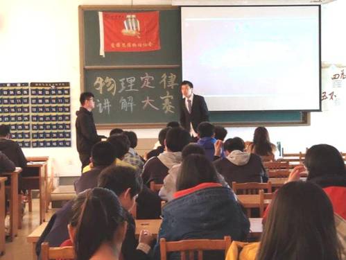 活动伊始,于立军向参赛人员介绍活动评委及活动流程,于立军表示:此次活动的目的是使同学们更好的了解物理并提高在实际生活中应用物理知识的能力。随后,参赛者按照一定的次序上台,利用PPT向同学们讲解物理定律。参赛者主要介绍了他们所选的物理定律的来源及演变过程,负责答疑的同学对评委提出的问题加以解答。臧笑妍、王璇小组向同学们讲解“光的折射”定律,“光通过光学性质不均匀的介质时,在偏离正常光的传播方向上有光出射的现象叫做光的折射”,路梦雅以举例子的方式系统阐述这一定理,并在讲解过程中与在场同学进行友好互动,获得同学们的热烈掌声。谢立朝、臧珊珊、田梦小组针对“动量守恒”物理定律进行讲解,通过“小鸟撞飞机”的现实例子进行引入,并讲述“动量守恒”的推导过程,引起同学们的认真讨论。活动最后由于立军总结此次活动并对同学们的表现加以点评。此次活动大家积极参与,讲解各种物理定律,展现出来同学们丰富的物理知识。