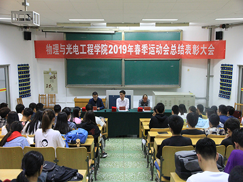 5月10日晚,物光学院于15号教学楼101教室举行2019年春季运动会总结表彰大会。学院党支部副书记范小平、辅导员崔鹏出席本次大会,大会由辅导员张起主持。