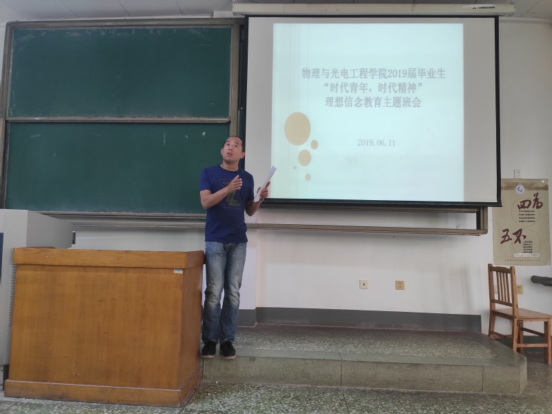 在临近毕业之际,为传播和弘扬爱国主义精神,坚定信念、树立青年理想,6月11日晚我院2019届毕业生“时代青年·时代精神”——理想信念教育主题班会与15号教学楼203教室顺利召开。班会由毕业生辅导员崔鹏主持,2019届全体毕业生参与。