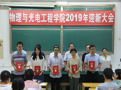 会议伊始,范小平代表学院全体教师为2019级新生的到来表示热烈欢迎,并依次介绍与会各位领导、老师。大会进行第一项,奏国歌,全体师生起立,共唱国歌。第二项,举行班级导师聘请仪式。范小平表示,学院将全力支持各班级导师开展工作,并表示希望各班级导师认真履行工作职务,爱岗敬业。大会第三项,由教师代表秦华致辞。他指出大学生学习物理的重要性,帮助全体同学树立专业信心与就业自信。随后,他表示希望全体同学尽快适应从中学到大学角色的转变,变被动学习为主动学习。大会第四项,硕士生代表袁俊杰及本科生代表吕琪与大家分享成长经验,以亲身经历提出自己的观点和建议。大会第五项,由2019级新生代表李天舒演讲。他讲到作为一名刚进入大学的学生,要积极转变思维、融于学习、严于律己,成为对国家和社会有用的人才。大会第六项,院长董云会致辞。他首先为新生介绍学院专业分类、发展前景等基本信息情况,后又从如何自律、自主学习,如何学会生活,如何做一位有理想、有责任之人,如何爱校等四个方面展开讨论。期间,他着重强调大学生应尽快制定职业生涯规划,明确学习目标。最后,大会进行第七项,全体师生合唱校歌。