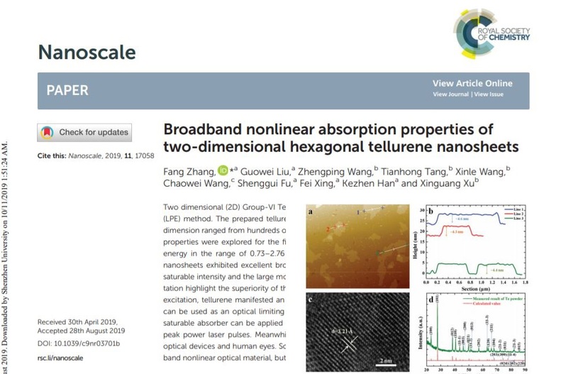 近日,由张芳老师指导的研究生刘国伟在国际知名期刊《Nanoscale》(影响因子:6.97)发表题为“Broadband nonlinear absorption properties of two-dimensional hexagonal tellurene nanosheets”的论文。