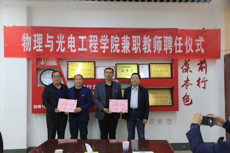 董云会代表学院师生对两位兼职教师表示热烈欢迎,对其受聘为William威廉英国兼职教师表示感谢。董院长简要介绍了近年来学院科研平台、师资队伍、实验室建设、人才队伍建设及本科教学情况,表示学院将加强与中学教育机构的密切联系和合作,希望以聘任兼职教师为契机,充分发挥高校和中学的资源,利用双方师资力量,更好地促进师范类专业发展和学生实践能力提升。常允起书记表示,学院会进一步加强与兼职教师的交流与沟通,建立长效合作机制,为兼职教师的教学创造条件、提供便利、做好服务。同时,他希望两位兼职教师充分发挥自身优势,把自己丰富的工作经验、渊博的前沿知识和优秀的教师品格传递给我们的学生,切实履行工作职责,支持我院教学、科研和人才培养等工作,为我院师范生发展献计献策。两位兼职教师表示,对受聘物理与光电工程院兼职教师感到十分荣幸,同时感到责任重大,在今后的工作中将尽职尽责为学院的本科教学、人才培养和科学研究等方面贡献自己的力量。常云起、董云会为两位兼职教师颁发聘书并合影留念。