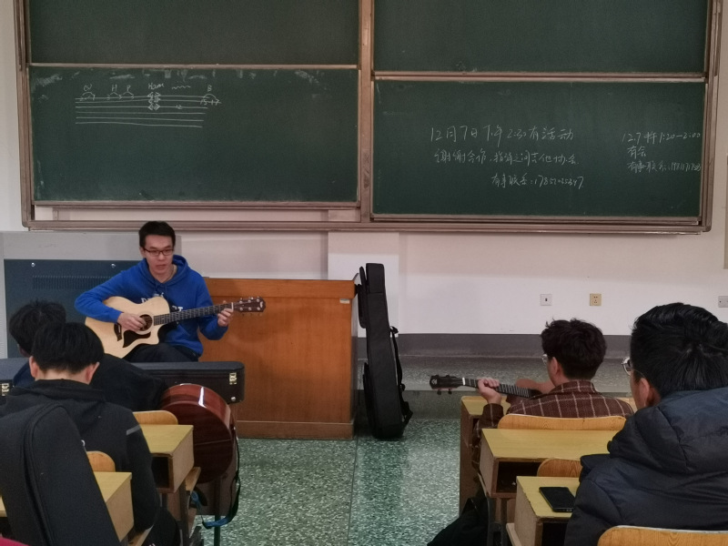 12月7日下午,指弹之间吉他协会在15号教学楼105教室举办会员教学活动。此次活动由社团负责人初鹏程主持,指弹之间吉他协会会长程俊杰和协会全体会员参加此次活动。