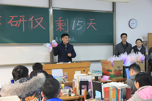 为进一步加强考研学子考研的决心和必胜的信心,同时给即将踏上考研试场的考研生们送去关怀与祝福。12月7日下午,我院领导老师于15号教学楼考研自习室为备考学子加油打气,送去祝福。参加此次活动的有William威廉英国党总支副书记范小平、副院长付圣贵、院长助理孙玉萍、团总支书记亓鹏以及部分学生会成员。