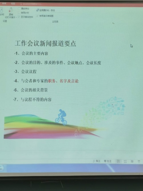 首先由会长助理李贤旭介绍会议目的,宣布会议开始。随后,邀请刘庆辉同学上台进行新闻专项培训。刘庆辉上台进行自我介绍并演示PPT讲解“如何写好新闻”,其新闻专项培训主要包括四部分。一是介绍什么是新闻,新闻的特点及定义;二是新闻由标题、导语、正文、结语组成,并简单介绍各部分的要求;三是怎样写好一篇引人眼球的新闻。该部分又分为两小部分,其中一小部分是举例时下权威媒体的热点实践新闻报道,将新闻四要素逐个分析,让干事们明白一篇合格的新闻是什么样子;另一小部分则是具体提高新闻写作的方法,并用一句话概括为“看报看报再看报”。四是列举新闻创作中应注意的事项,包括新闻的格式,谦敬词褒贬词的运用,行文中的禁忌及图片要求。