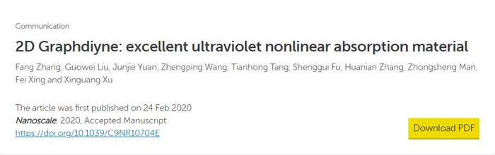近日,由研究生刘国伟、袁俊杰共同操守实验,张芳老师指导并书写的,题为“2D Graphdiyne: excellent ultraviolet nonlinear absorption material”的文章在国际知名期刊《Nanoscale》(影响因子:6.970)上发表。