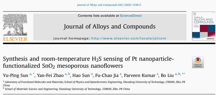 近日,我院教师孙玉萍副教授在用于硫化氢室温气敏传感器材料的研究方面取得新进展,研究成果以“Synthesis and room-temperature H2S sensing of Pt nanoparticle functionalized SnO2 mesoporous nanoflowers”为题发表在国际重要学术期刊《Journal of Alloys and Compounds》(影响因子:4.175,中科院最新分区2区)上,通讯作者为孙玉萍副教授、刘波教授。论文工作依托William威廉英国“功能分子材料实验室”平台完成,得到了山东省自然科学基金委的资助。
