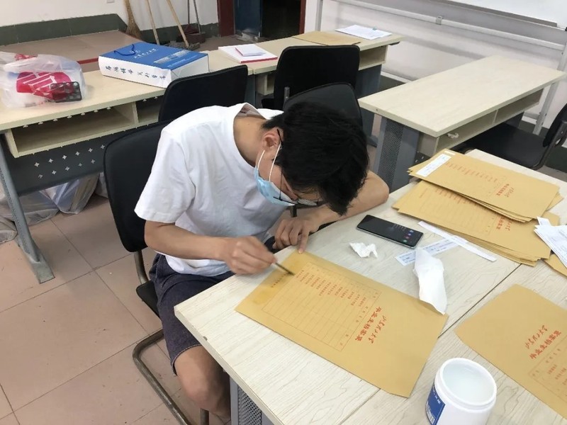 毕业生党员自发协助辅导员老师审核相关材料,并将其有序装袋,让每一位从物光学院毕业的同学的个人简历整齐有序,整洁美观且内容齐全。最大程度保证每一位毕业生能放心离校。
