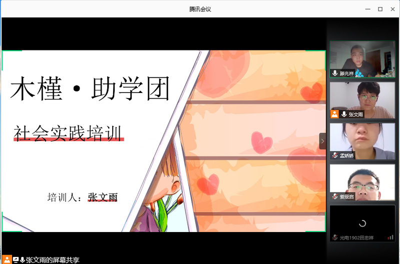 7月19日晚,木槿·助学团全体成员于腾讯会议召开动员暨培训大会。队长张文雨带领队员一起学习社会实践中的内容、安全指南和应急预案,并且就即将开展的社会实践进行整体部署。