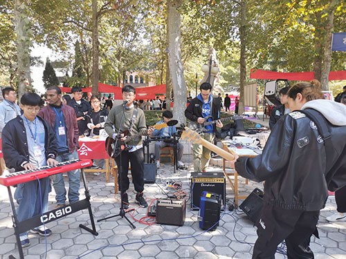 活动开始前,协会成员积极筹备会场,包括乐器调试、节目音乐彩排练习等工作。随着各年级同学聚集在中心花园,并跟随志愿者引领陆续入场,2020年社团集中宣传纳新暨社团文化节开幕式活动正式拉开帷幕。中午12时40分开幕式正式开始,各个社团节目相继表演,大显风采。其中我院指弹之间吉他协会以一首《向阳花》震撼全场,主唱李林恒伴着吉他充满律动的声音感染在场所有观众。贝斯手为旋律衔接做好铺垫,鼓手则准确敲击节奏烘托气氛。随后而来的一曲《都选C》则将现场氛围推至高潮,现场掌声连连,观众反响热烈。
