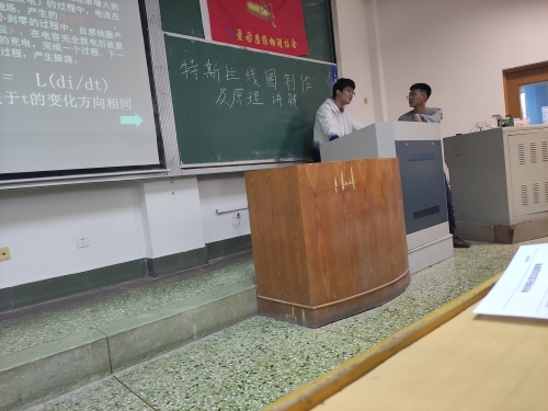 活动伊始,由李现旭做简短开场,宣布活动正式开始。随后,由夏震洋上台为大家做讲解,并展示特斯拉线圈。在讲解中,夏震洋积极讲解特斯拉线圈的制作方法,以及制作完成后如何进行操作,并展示特斯拉线圈的物理现象,大家都被物理现象所吸引,并积极主动的提出各种问题,夏震洋都一一回答。