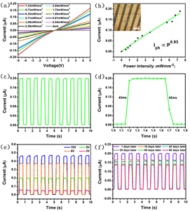 图3 (a)基于CsPb2Br5纳米片的光电探测器在不同入射光功率下的I-V特性。(b)偏置电压为5V时,光电流对光功率密度的依赖关系。插图:制作好的光电探测器的显微镜图像。(c)光强为7.33 mW mm-2、偏置电压为5 V的405 nm激光照射下的时变光电流测量。(d)光电流上升和下降时间。(e)不同电压下的I-T测量,光强为7.33 mW mm-2。(f) CsPb2Br5纳米薄片在室温空气中的稳定性测定