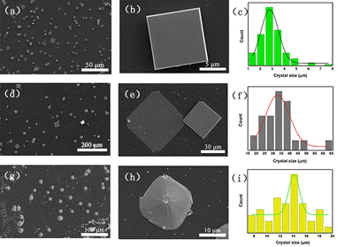 图2. (a)、(d)和(g)分别是在25 °C、45 °C和55 °C的衬底温度下制备的CsPb2Br5纳米薄片的SEM图像。(b)、(e)及(h)分别为(a)、(d)及(g)的不同放大倍数图像。(c)、(f)、(i)是三种不同温度下的对应的粒度分布直方图。