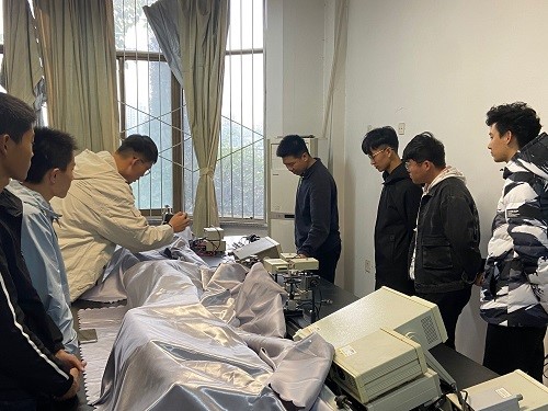 在讲解过程中,王明硕适时地给同学们提出问题,引发同学们的思考,整个参观活动不失活泼而又兼具科学的严谨性。在接下来的参观时,同学们对共焦球面扫描干涉仪、液晶空间光调制器产生浓厚兴趣,不断向学长提问,整个场面十分的热烈。