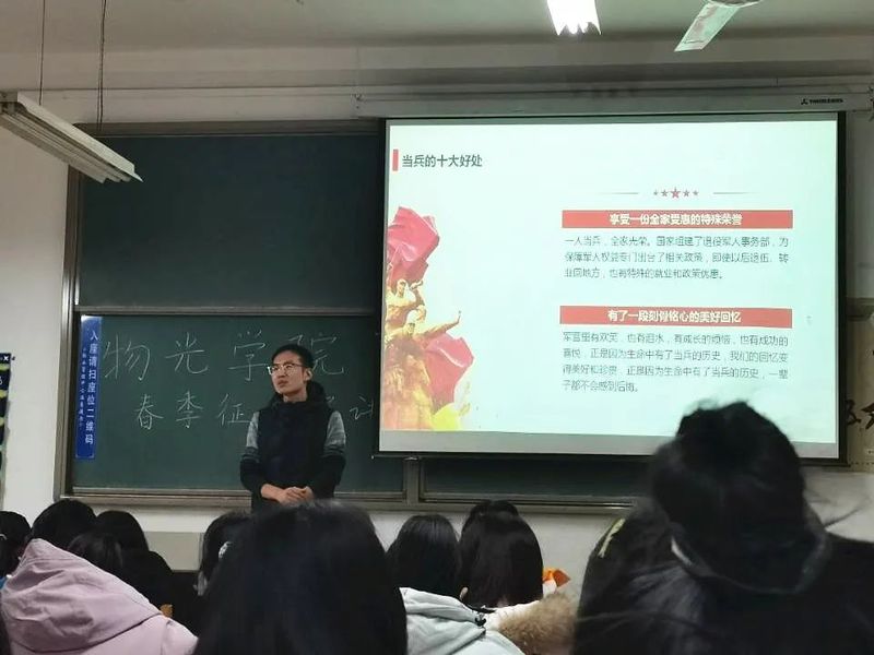为进一步贯彻落实我省征兵工作相关要求,扎实推进我校大学生应征入伍工作,我院于2020年12月15日18:50在15号教学楼340教室和203教室召开2021年征兵入伍宣讲和征兵入伍主题班会。此次会议由优秀退役大学生代表王浩成、刘峰、张媛媛、吴刚和2020及辅导员张继武同本院2020级同学共计200余人参加。