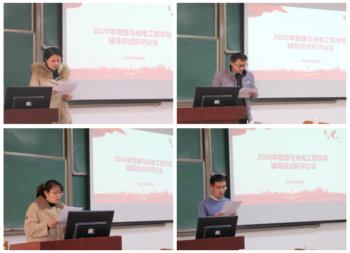 随后,亓鹏、张起、王芳和张继武四位辅导员依次发言。四位辅导员老师全面详细介绍了在过去一年工作完成情况和亮点,查找了工作中存在的问题,并分析原因,明确发展思路。汇报完毕后,评委们为四位辅导员进行了现场打分。