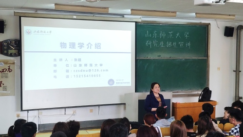 4月20日上午我院于15号教学楼203教室成功举行山东师范大学研究生招生宣讲活动。宣讲活动由山东师范大学物理学学位点负责人张超、光电信息科学与工程专业负责人任莹莹主讲,学院副院长孙玉萍主持,学院辅导员代表以及18、19级有意向报考山东师范大学研究生的学生参加此次宣讲活动。