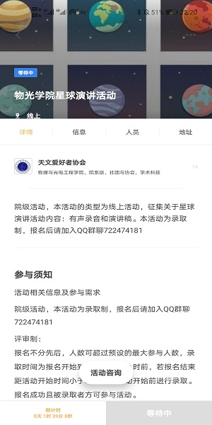 活动开始前,天文爱好者协会在到梦空间APP上进行宣传工作,学生可于5月29日至5月31日进行线上报名,同学踊跃参加。6月1日,天文爱好者协会负责人闫泽青于活动群内发布相关活动事宜,活动于6月1日正式开始。活动开始,闫泽青将活动规则发布在活动群中,6月1日至6月3日,参与活动的同学录制音频或视频后提交文件到QQ邮箱,采用录取制,6月3日早,活动结束。