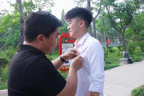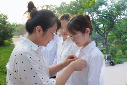 张继武、王芳和徐凯依次为每位新党员佩戴党徽,通过他们和蔼的目光与亲切的话语中无不表达出他对新党员们的关怀与期望。他们期待新一批党员们继续发扬优良作风,在同学们中积极发挥先锋模范作用。