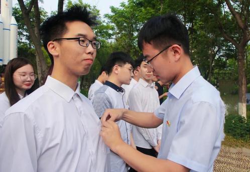 张继武、王芳和徐凯依次为每位新党员佩戴党徽,通过他们和蔼的目光与亲切的话语中无不表达出他对新党员们的关怀与期望。他们期待新一批党员们继续发扬优良作风,在同学们中积极发挥先锋模范作用。