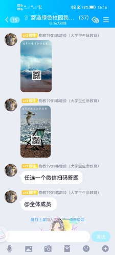 为普及世界环境日,增强学生的环保意识,提高学生对环境问题的重视,我院大学生生命教育协会于6月6日至6月12日在腾讯QQ举办“营造绿色校园我们在行动”线上活动。此次活动由大学生生命教育协会负责人韩增龄主持。