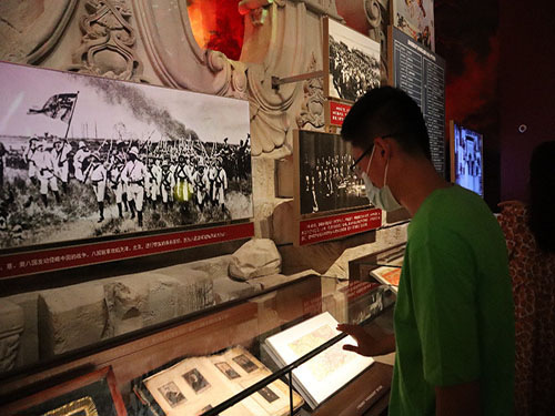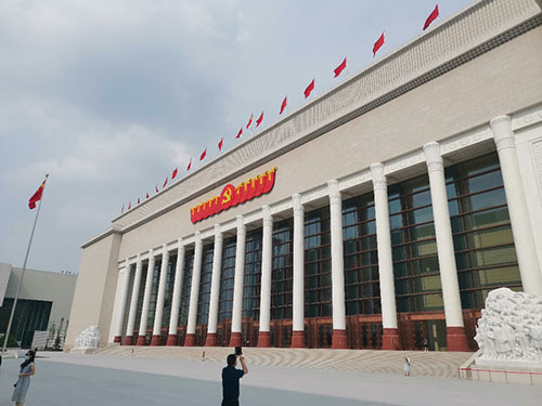 14根大理石圆柱挺立在展览馆的西侧,白色大理石的柱身和光滑的红色大理石柱底,宏伟的建筑,无一不彰显着象征党的光辉历史。