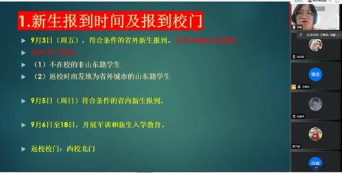 随后,朱峰就疫情防控相关要求和学校关于2021级新生报到的安排,带领新生进行了详细解读,并向新生介绍了报到具体时间及相关要求,确保在报到过程中所有同学安全有序顺利到达学校。