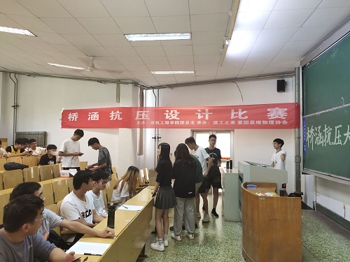 为增强同学们理论与实际相结合的应用思维,展现当代大学生的青春风采,我院爱因思维物理协会于9月12日下午在15号教学楼102教室协助举办桥涵抗压设计比赛。此次活动由建筑工程学院团总支主办,建工之家和爱因思维物理协会协办。各个学院学生报名参与活动,建工之家会长刘攀超对大会进行主持。