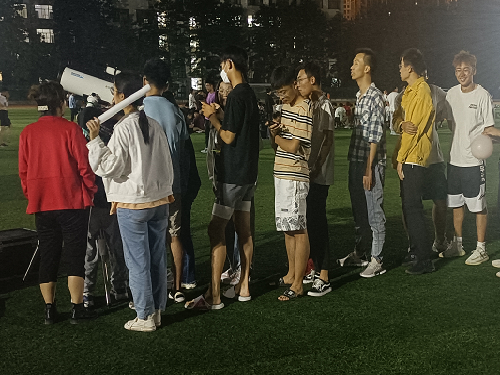 活动伊始,参加活动的学生来到第四号体育场。天文爱好者协会此次活动的负责人员各司其职,组装人员在活动正式开始前顺利组装并调整好观测设备,其他负责人员负责维持活动现场秩序,同时认真回答前来参与活动的学生提问的问题。观测设备尚未架好便已经排起了长队。