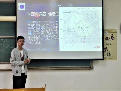 活动开始前,张韫东及社团干事进行了充分地准备。活动开始先由王扬进行 “群星点点入梦来”的宣讲,王扬先介绍了本次宣讲的组成具体星座介绍、天文学学术知识介绍和具体天体介绍,随后介绍了人马座、白羊座等星座并分享了有关他们由来的故事。接着王扬分享了星云、黄道及夏季大三角等天文学学术知识,并配合图片进行了深入地讲解。随后黄昊以“起源于神话的壮丽”为题进行宣讲,通过古希腊关于众神的神话介绍了仙后座、仙王座等星座的所处位置、形状、运行轨迹及组成。最后,王扬对本次宣讲的内容进行了提问,同学们积极回答,反响热烈。