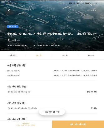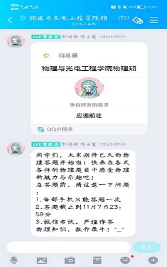 11月7日,我院光电先锋社于线上举行“物理知识,数你最牛”趣味物理知识竞赛活动。本次活动由新闻部部长王振龙主持,新闻部成员杨树盛负责活动策划,陈占鳌、赵兹杰负责题目设计。本次活动共有60名同学参与。