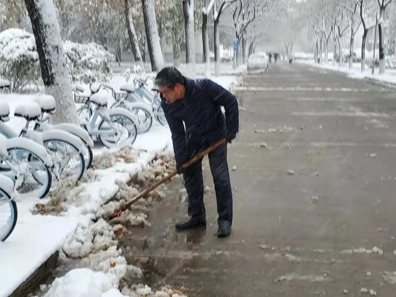 本次除雪活动,我院主要清理了15号教学楼门前及文明路上的积雪。参与除雪的老师及学生,携带着由学院统一准备的铁锹和扫帚等工具,首先在15号教学楼门前集合,由付圣贵和范小平分别带领学生会成员和学生党员,从15号教学楼门前,有序的向外清理。几支小队各自分工,经过1个多小时的努力奋战成功将负责区域积雪清扫干净。