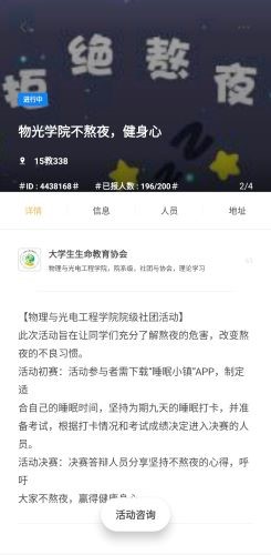 本次活动分为初赛和决赛两个进程,活动初赛采用线上方式进行,活动参与者下载“睡眠小镇”APP,在软件中制定适合自己的睡眠时间,坚持连续九天睡眠打卡。社团相关工作人员根据打卡情况决定进入决赛的人员。活动决赛于11月25日在15号教学楼340教室采用线下方式进行,由焦晓东主持。此次活动决赛结果如下:高春燕、纪洪明、增祥曦等六名活动参与者获得一等奖,张文杰、李佳欣、段惠文等十名活动参与者获得二等奖,苏泓力、张泽良、郭进取等十五名活动参与者获得三等奖。