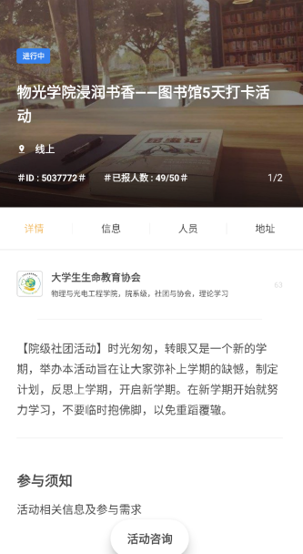 为了鼓励我院学生到图书馆学习,制定新学期新计划。与此同时,带动我院学生反思上学期,开启新学期,培养良好阅读习惯。3月7日到3月11日期间,我院举办浸润书香––图书馆5天打卡活动,本次活动大学生生命教育协会承办。