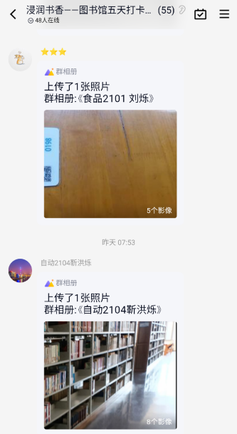 活动伊始,大学生生命教育协会组织学生统一制定图书馆学习总计划,同时建立线上群聊将活动参与者联系起来。活动过程中,参与活动的同学按照自己当天学习情况自行制定浸润图书馆学习小计划,并且拍下学习场景在群聊中上传进行打卡。另外,参与活动的同学可在线上彼此交流图书馆学习心得,按照总计划不断努力前进。活动结束后,参与其中的学生纷纷表示,活动期间的坚持不仅养成了习惯,更加磨炼了自己的心性。