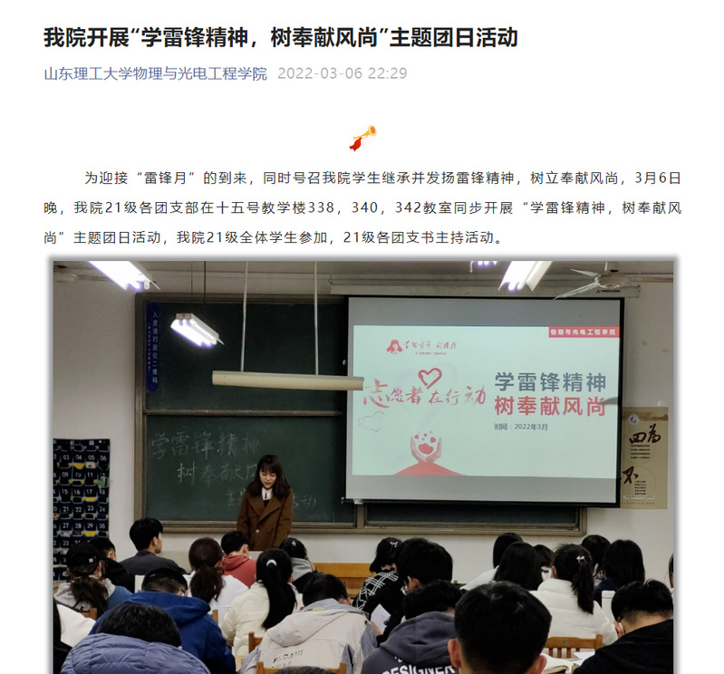 为迎接“雷锋月”的到来,同时号召我院学生继承并发扬雷锋精神,树立奉献风尚,3月6日晚,我院21级各团支部在十五号教学楼338,340,342教室同步开展“学雷锋精神,树奉献风尚”主题团日活动,我院21级全体学生参加,21级各团支书主持活动。