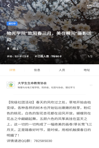 本次活动鼓励学生走出户外,通过踏青与大自然接触,放松心情,并且用手中的相机记录校园美景。活动期间,同学们拿起相机走进校园的各个角落,围绕“致阳春三月,美在瞬间”的活动主题,运用各种拍照技巧,捕捉校园里美丽的瞬间,摄影作品从各个方面体现阳春三月美景。活动参与者将摄影作品上传到群相册中,由协会工作人员根据规则统一进行评奖。参与到本次活动中的学生表示在活动期间,他们在发现、享受校园美景的同时,能够更加珍惜校园的学习环境和生活环境。