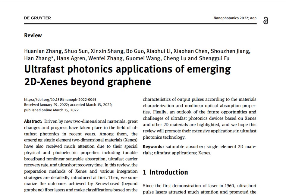 近日,我院张华年副教授、付圣贵教授团队应邀在国际权威期刊《Nanophotonics》(影响因子:8.449)上发表题为“Ultrafast photonics applications of emerging 2D-Xenes beyond graphene”的综述论文。