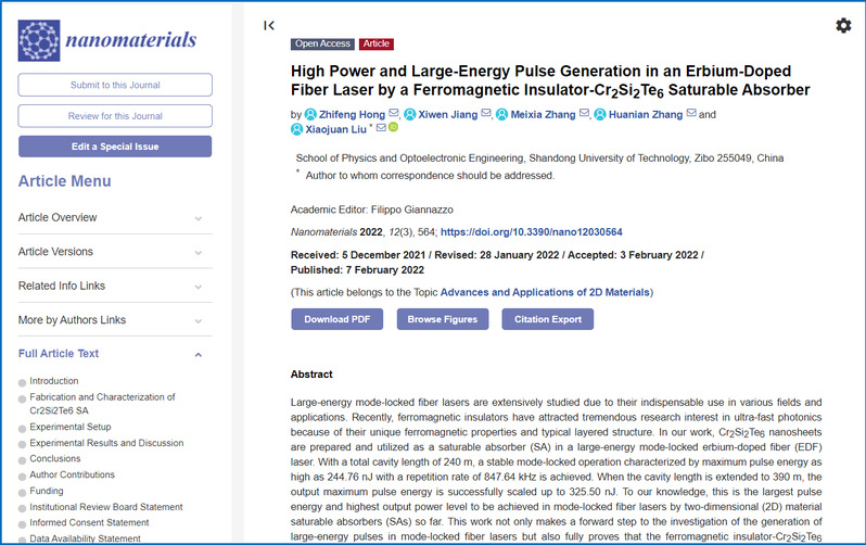 近日,《Nanomaterials》(IF: 5.076)在线报道了我院刘晓娟副教授及合作者在光纤激光技术领域的重要进展。原文链接:https://doi.org/10.3390/nano12030564。